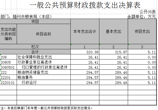 隨州市糧食局本級2017年財政撥款支出320.98萬元,比年初預算減少345.34萬元,減少51.83%,主要原因隨州市級戰略儲備糧項目388萬元財政直接撥付到項目實施非預算單位,年底未納入決算數據;比上年增加32.7萬元,增加11.34%,主要原因是:2017年實行養老保險改革,養老保險和職業年金繳費增加,項目支出增加。其中:基本支出315.87萬元,比上年增加27.59萬元,增加9.57%;項目支出5.11萬元,比上年增加5.11萬元,增加100%。