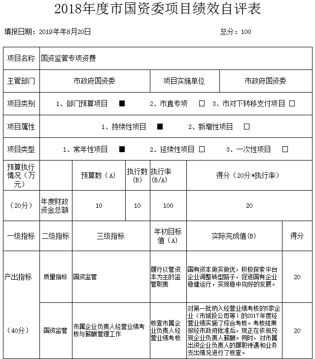??對照年初的目標任務和考核要求,我委堅持實事求是的原則,以績效考核的各項文件精神為指導,以整體績效支出為內容,對2018年度各項支出的質量指標,數量指標等內容進行了自評,自評得分98分,績效等級為優。