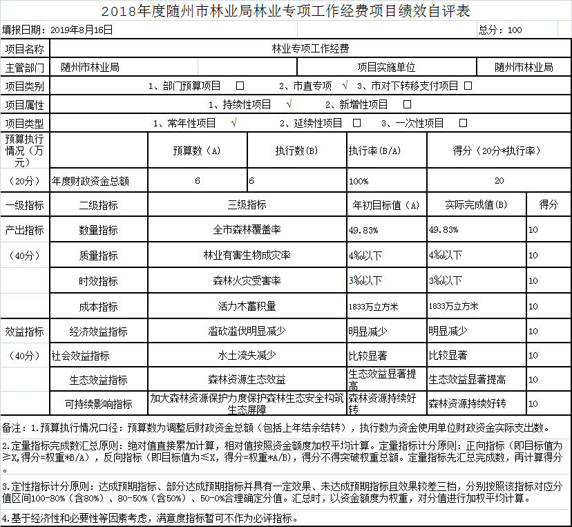 根據(jù)《市財政局關(guān)于2018年開展財政支出績效評價工作的通知》(隨財發(fā)〔2019〕9號)文件精神,我單位從任務(wù)完成、實施措施、資金管理及使用、項目效益等方面開展了2018年度林業(yè)專項工作經(jīng)費支出項目績效自評工作。