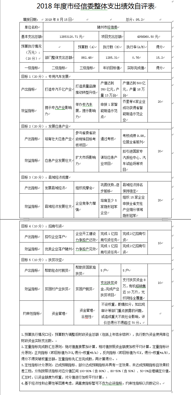 對(duì)照年初的目標(biāo)任務(wù)和考核要求,我委堅(jiān)持實(shí)事求是的原則,以績效考核的各項(xiàng)文件精神為指導(dǎo),以整體績效支出為內(nèi)容,對(duì)各項(xiàng)支出的質(zhì)量指標(biāo),數(shù)量指標(biāo)等內(nèi)容進(jìn)行了自評(píng),自評(píng)得分95.2分,達(dá)成預(yù)期指標(biāo)。目標(biāo)完成情況如下: