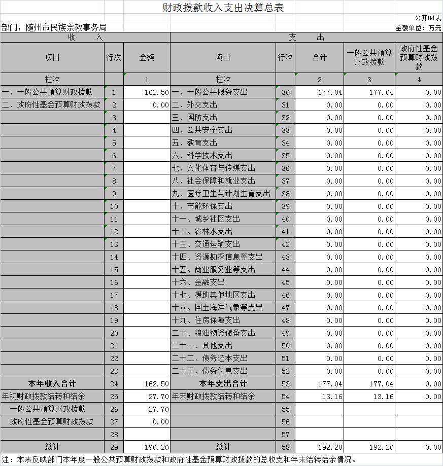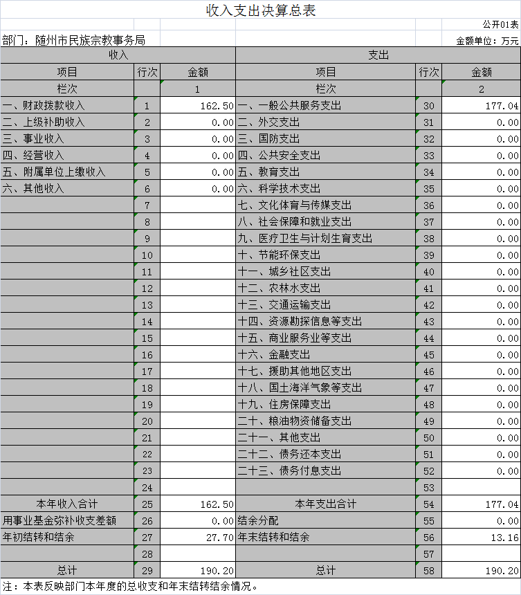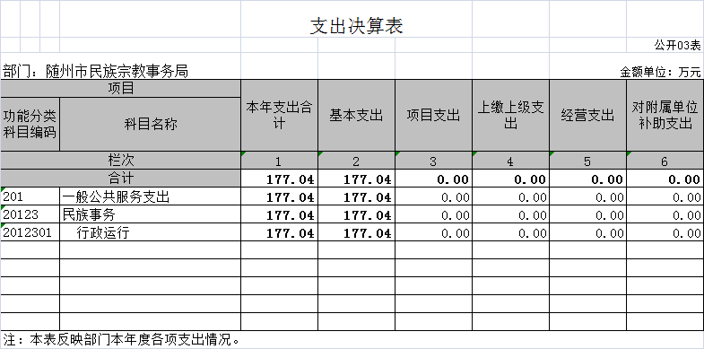 市民宗局2018年度決算收入190.2萬元,比2018年度減少3.06萬元,減少1.5%,減少原因:2018年省撥資金減少。 2018年度決算支出177.04萬元,比2017年度增加11.49萬元,增加6.9%,增加原因:對民族宗教領域幫扶力度加大,支出增加。