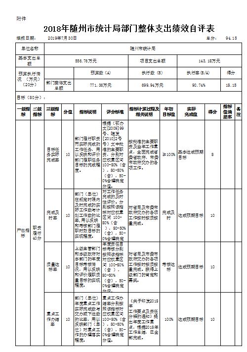 根據(jù)《2018年市統(tǒng)計局整體支出績效自評表》中績效指標(biāo)分析評分,隨州市統(tǒng)計局2018年部門整體支出績效自評得分94.15分,績效評價等級為優(yōu)。
