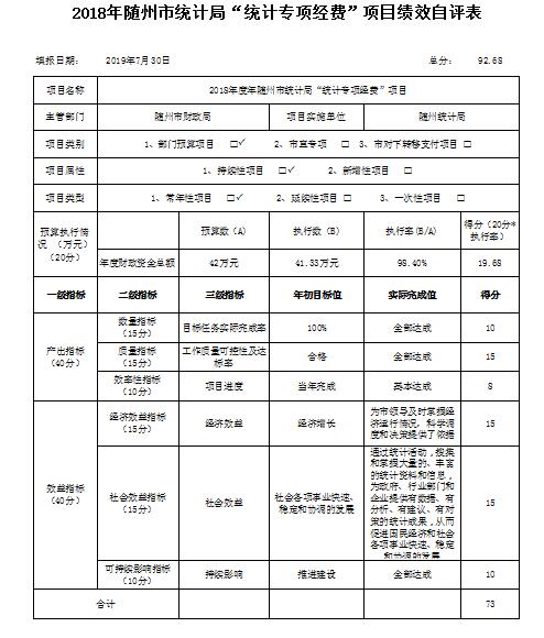 根據(jù)《2018年市統(tǒng)計局“統(tǒng)計專項經(jīng)費”項目績效自評表》中績效指標(biāo)分析評分,隨州市統(tǒng)計局2018年度“統(tǒng)計專項經(jīng)費”項目績效自評得分92.68分,績效評價等級為優(yōu)。