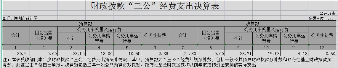 市統(tǒng)計局2018年財政撥款機關(guān)運行經(jīng)費59.14萬元,比上年33.87萬元增加74.6%。其中辦公費2.80萬元,比上年1.77萬元增加58.19% ;水電費2.94萬元,上年0元;郵電費0.79萬元,比上年0.29萬元增加172.41%;物業(yè)管理費0.12,上年0元;差旅費1.80萬元,比上年0.08萬元增加2150%;會議費0萬元,比上年0.11萬元減少100%;公務(wù)接待費0.6萬元,比上年0.98萬元減少38.78%;勞務(wù)費3.57萬元,比上年3.74萬元減少4.55%;公務(wù)用車運行維護費2.79萬元,比上年0.95萬元增加193.68%;其他交通費用0.0075萬元,比上年20.96萬元減少99.96%;其他商品和服務(wù)支出8.85萬元,比上年2.77萬元增加219.49%;辦公設(shè)備購置0.15萬元,比上年2.22萬元減少93.24%,公務(wù)用車購置19.53萬元,去年0元。增減原因:厲行節(jié)約,嚴(yán)格管理,大幅縮減了各項運行經(jīng)費開支,公務(wù)交通補貼不再計算在其他交通費用中,計算在人員經(jīng)費開支中,2018年新購置了公務(wù)用車,開展隨州市全國第四次經(jīng)濟普查相關(guān)辦公費、差旅費、公務(wù)用車費增加;職工工作餐開支計算在其他商品和服務(wù)支出。