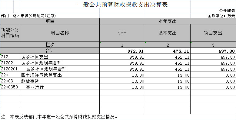 隨州市城鄉規劃局(匯總)2018年初財政預算撥款支出972.91萬元,決算數為972.91萬元,其中:基本支出決算數475.11萬元,項目支出決算數497.8萬元。