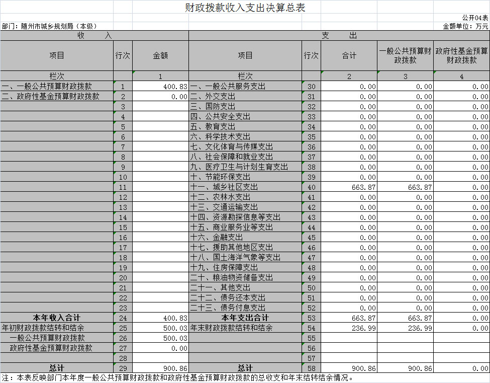 隨州市城鄉規劃局(本級)2018年初預算財政撥款為1504.22萬元,其中:經費撥款216.6萬元,政府性基金收入1287.62萬元。2018年財政撥款實際撥入數為400.83萬元,其中:一般公共預算財政撥款400.83萬元,無項目支出撥款。