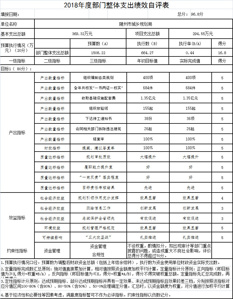 我單位組織開展2018年度整體支出績效評價,從評價情況來看,本次市城鄉規劃局整體支出績效評價結果良好,公眾的滿意度高,達到了預定的目標。