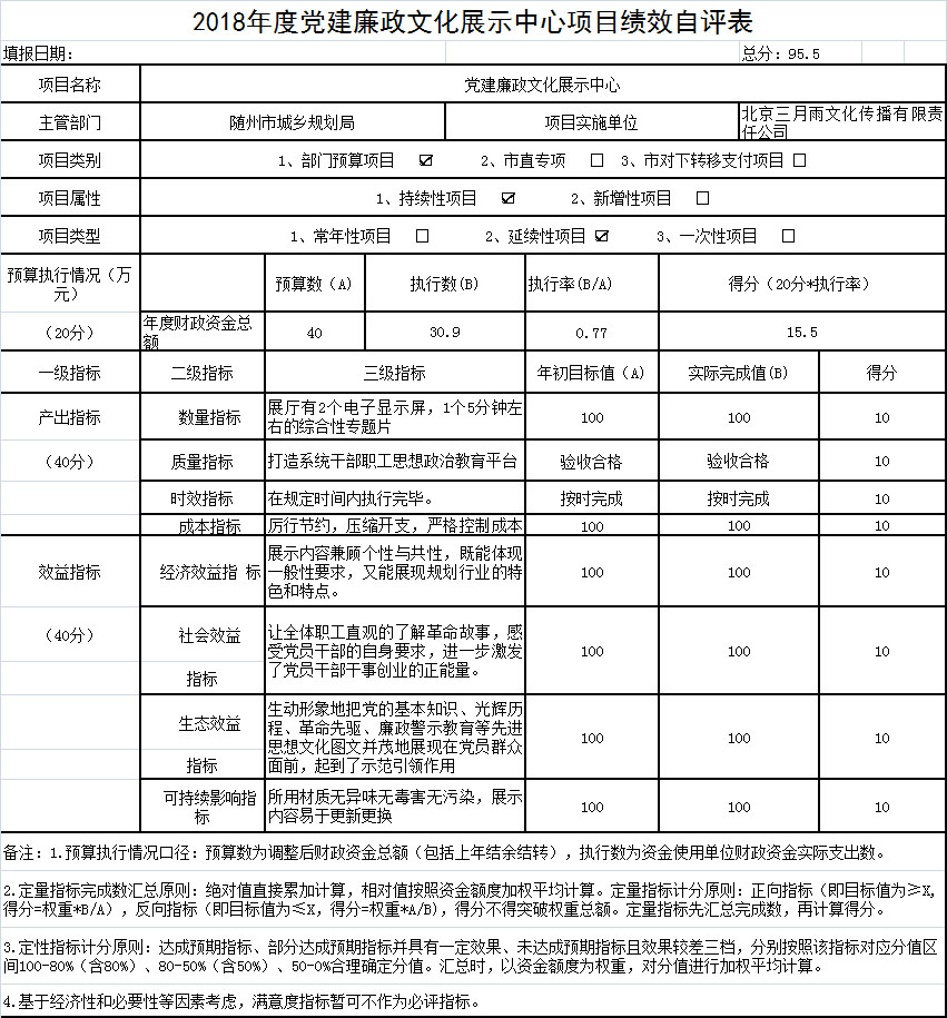 附件:《隨州市城鄉規劃局2018年度黨建廉政文化展示中心項目績效自評表》