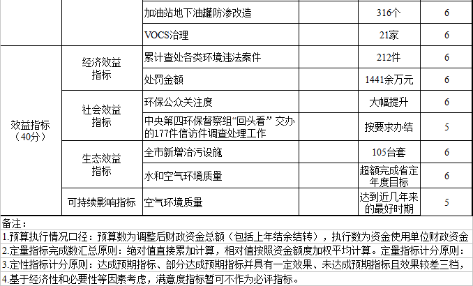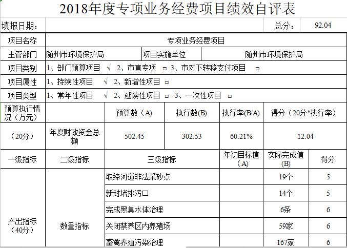 ①專項業務費項目績效自評:項目全年預算數為502.45萬元,執行數為302.53萬元,完成預算60.21%。主要產出和效果:一是空氣質量省定目標超額完成;二是水環境質量達到省考核要求;績效自評工作建議:進一步加大機關運轉經費保障,使各個專項工作目標的實現得到充分保障。