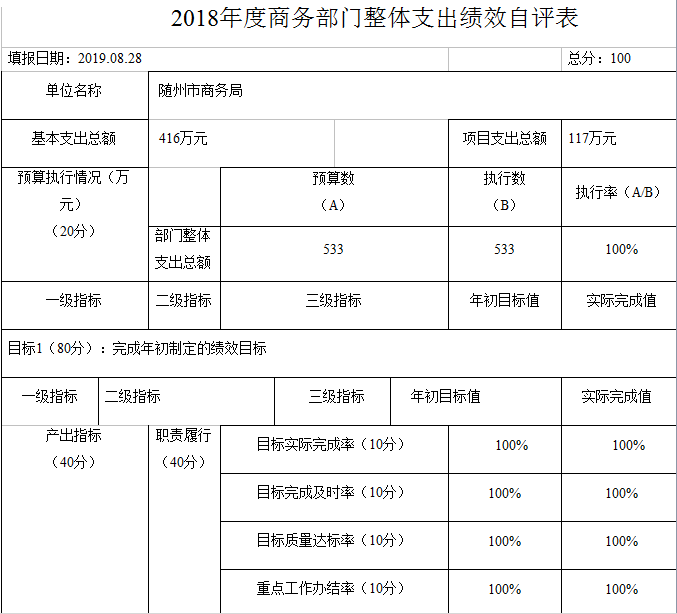 本年主要政務工作的績效目標基本實現。結合“雙促、雙學、雙建”活動,在媒體刊發《隨州市商務局服務承諾》,向服務對象、基層單位發放征求意見函,征求意見和建議,廣泛接受社會監督。在服務窗口、機關科室、商務網站進行“評機關評站所不為亂為促進擔當服務”活動微信二維碼評議;經過上級機關考核 4個工作要點項目已全部達標。