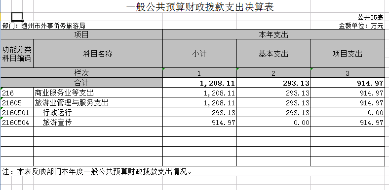 商業服務業等支出1208.11萬元,較2017年1913.4萬元減少705.29萬元,減少36.86%,主要原因是參加央視首屆魅力中國城評選,旅游廁所革命創建獎勵等項目經費減少;年末財政撥款結轉和結余119.96萬元。全年度合計1328.07萬元。
