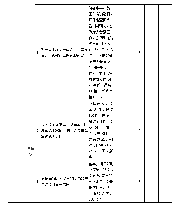 主要產(chǎn)出和效益:1、持續(xù)開展政府系統(tǒng)“大調(diào)研”活動,緊緊圍繞國家重大發(fā)展戰(zhàn)略和市委市政府重要決策部署,聚焦基層創(chuàng)新經(jīng)驗和經(jīng)濟(jì)社會發(fā)展重大課題開展調(diào)查研究,形成了一批質(zhì)量較高的調(diào)研報告,并及時編印《政務(wù)調(diào)研成果匯編》供各地各單位學(xué)習(xí)交流。2、狠抓信息服務(wù)。全年編發(fā)本級《政務(wù)信息》28期,《政務(wù)信息特刊》16期,《專報信息》14期,上報省政府辦公廳信息600多條,其中,被省政府辦公廳采用77條,被國務(wù)院辦公廳采用17條,有1條獲國務(wù)院領(lǐng)導(dǎo)批示,1條獲省政府領(lǐng)導(dǎo)批示,3條獲市政府領(lǐng)導(dǎo)批示。3、規(guī)范文稿制發(fā)。全年共制發(fā)政府及政府辦公室各類文件204件,均做到了政策把握準(zhǔn)確、文字邏輯嚴(yán)密、文件格式規(guī)范,實(shí)現(xiàn)零紕漏。4、創(chuàng)優(yōu)文稿服務(wù)。倡導(dǎo)落實(shí)“短、實(shí)、新”優(yōu)良文風(fēng),全年共起草領(lǐng)導(dǎo)講話、情況匯報等各類文稿400余篇,較好把握了當(dāng)前實(shí)際,發(fā)揮了推進(jìn)工作、加快發(fā)展的積極作用。5、加大督辦力度。突出抓好國務(wù)院“六穩(wěn)”工作部署和省市《政府工作報告》重點(diǎn)工作、省市領(lǐng)導(dǎo)重要批示件的督辦落實(shí),組織政府系統(tǒng)各部門季度述職評議活動3次,開展全市“迎國慶、保軍運(yùn)”信訪維穩(wěn)、“四個三重大生態(tài)工程”、城市重點(diǎn)工程建設(shè)、森林防火等重點(diǎn)督查工作,扎實(shí)做好省政府大督查反饋問題整改工作,全年共印發(fā)隨政督文件14期、《督查通報》14期、《督查要情》9期,有力地推動了省委省政府和市委市政府重大決策部署落地生效。6、認(rèn)真辦理“兩案”。辦理市人大議案2件、人大代表建議110件、市政協(xié)建議案3件、政協(xié)提案162件,積極開展“三見面”、二次辦理、“回頭看”辦理等活動,如期完成辦理任務(wù),市人大代表和政協(xié)委員滿意率分別達(dá)到98.2%、97.5%再創(chuàng)新高。7、嚴(yán)格應(yīng)急值守。認(rèn)真落實(shí)24小時值班、領(lǐng)導(dǎo)帶班、三級值班制度,加強(qiáng)重大節(jié)假日、敏感時期和災(zāi)害性天氣期間的值班,對緊急信息和重大事項實(shí)行限時報告。妥善解決人民群眾實(shí)際困難,全年共接待處理到市政府上訪事件200多起,涉及數(shù)千人,有力維護(hù)了社會大局穩(wěn)定。綜合評價結(jié)論:政務(wù)督查、議案提案辦理、總值班室、信息科、政府工作報告起草、離退休干部、政務(wù)會務(wù)接待、國動辦等專項工作順利有序開展,經(jīng)費(fèi)得到有效保障。