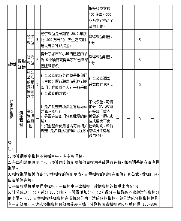 (4)效益指標(biāo)完成情況。主要對完成政府各項工作情況進(jìn)行評價,各項工作順利有序開展,經(jīng)費(fèi)得到有效保障,基本達(dá)到年初設(shè)定的績效目標(biāo)。