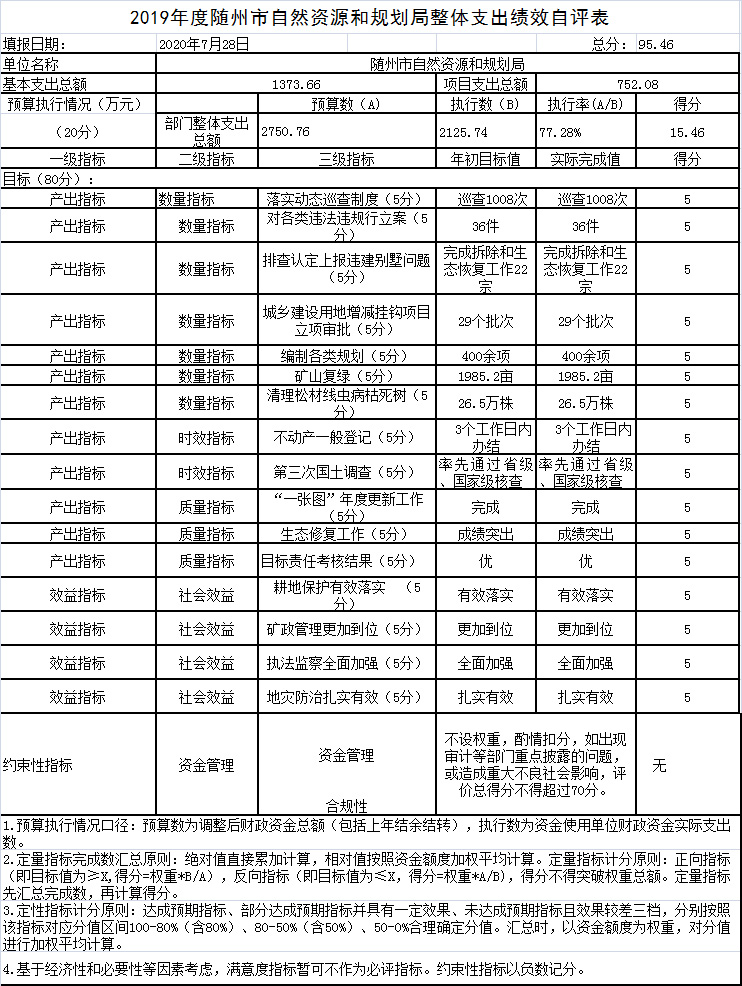 隨州市自然資源和規劃局2019年在市級部門決算中反映所有項目績效自評結果:
