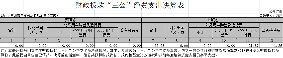 隨州市自然資源和規劃局(本級)2019年一般公共預算財政撥款“三公”經費支出29.23萬元,其中:1、因公出國(境)費支出6萬元,因公出國(境)人次數1人 ;2、公務接待費1.36萬元,國內公務接待29次,接待人數192人;3、本單位公務用車保留5輛,2019年無公務用車購置,公務用車運行維護費21.87萬元。隨州市自然資源和規劃局為2019年4月新組建單位,無上年對比數據。