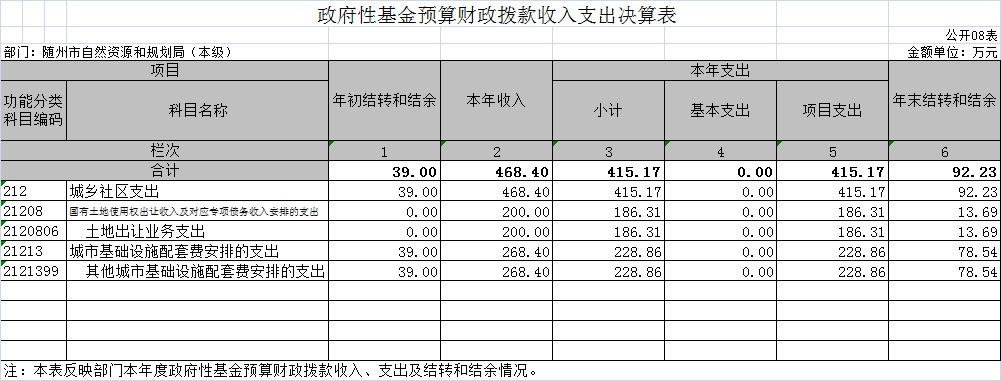 隨州市自然資源和規劃局(本級)2019年政府性基金收入468.40萬元,其中項目支出415.17萬元。隨州市自然資源和規劃局為2019年4月新組建單位,無上年對比數據。