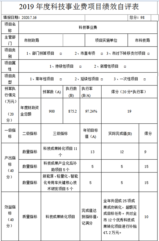 2019年,市財政局下達科技事業費預算指標900萬元,實際執行數875.2萬元,執行率97.24%。此項經費主要用于全市科技創新、成果轉化、市校合作業務以及科技惠民工作,資金使用績效較高,自評績效得分98分。