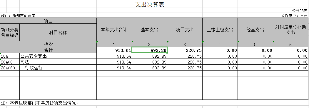 2019年我局決算支出總計913.64萬元,年末結轉和結余160.81萬元。比上年決算支出增加207.83萬元,增幅約29.44%。主要是增加了人員經費支出(機構改革單位合并后人員增加)。2019年本級部門年支出913.64元中,基本支出692.89萬元,占本年支出合計的75.84%,較上年增加181.6萬元,增幅約35.52%,主要是增加了人員經費支出(機構改革單位合并后人員增加)。項目支出220.75萬元,占本年支出合計的24.16%。與上年決算增加26.23萬元,增幅13.48%,主要原因是增加了法治政府建設支出。2019年,我局財政撥款預算收入799.04萬元,財政撥款決算支出793.26萬元,支出減少了5.78萬元,主要原因是我單位厲行節約,各項支出減少。
