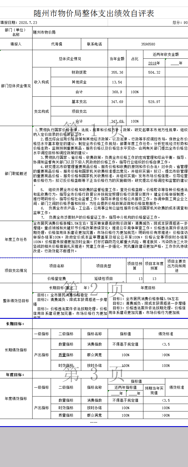 ????為深入貫徹落實新《預算法》和中央、省、市關于推進預算績效管理的有關精神,做好2019年度績效管理評價工作,為加強隨州市物價局部門財政資金管理,強化部門支出責任意識,提高隨州市物價局財政資金使用效益,我局對2019年整體支出開展了自評,現就自評情況報告如下: