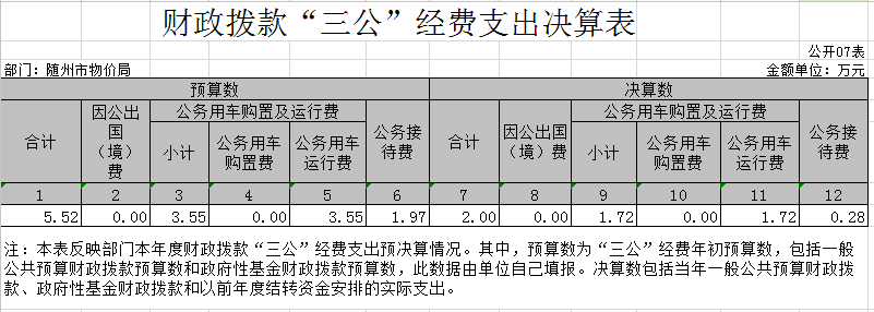????2019年隨州市物價局“三公”經費預算財政資金安排5.52萬元,決算2萬元。其中:因公出國(境)費預算0萬元,決算0,比上年持平,原因是近年來嚴控三公經費的支出特別是出國出境;公務接待費0.28萬元,比上年1.46萬元減少1.18萬元,減幅421%,其中,公務接待共6批次,來客人數共計18人次,陪客人數共計18人次;公務用車運行維護費1.72萬元,比上年2.01萬元基本持平。單位無公車購置數,公車1輛。