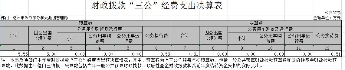 2019年市政務服務和大數據管理局“三公”經費支出預算數為5.55萬元,決算數為0.51萬元,完成預算的9.19%,與上年決算數0.58萬元相比減少0.07萬元,減少了12.07%,其中: