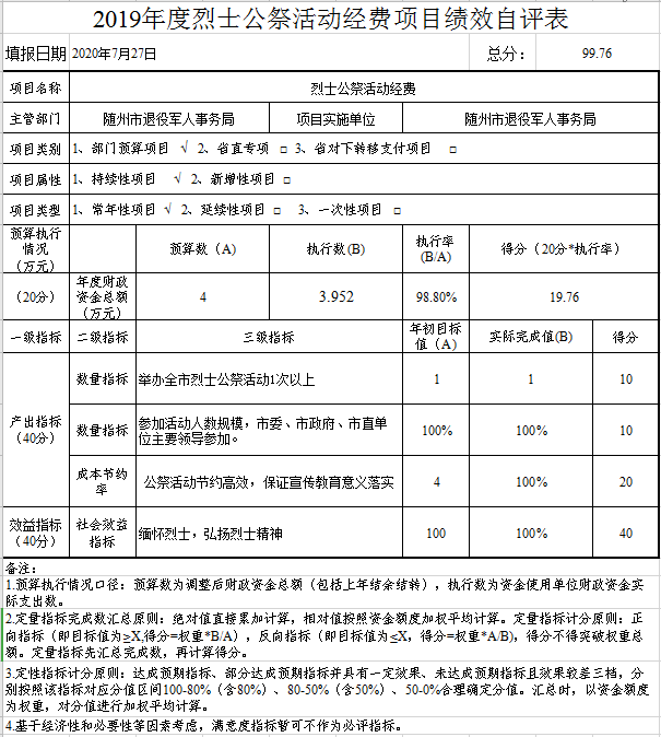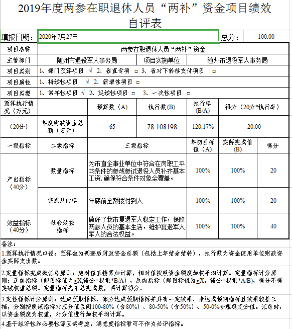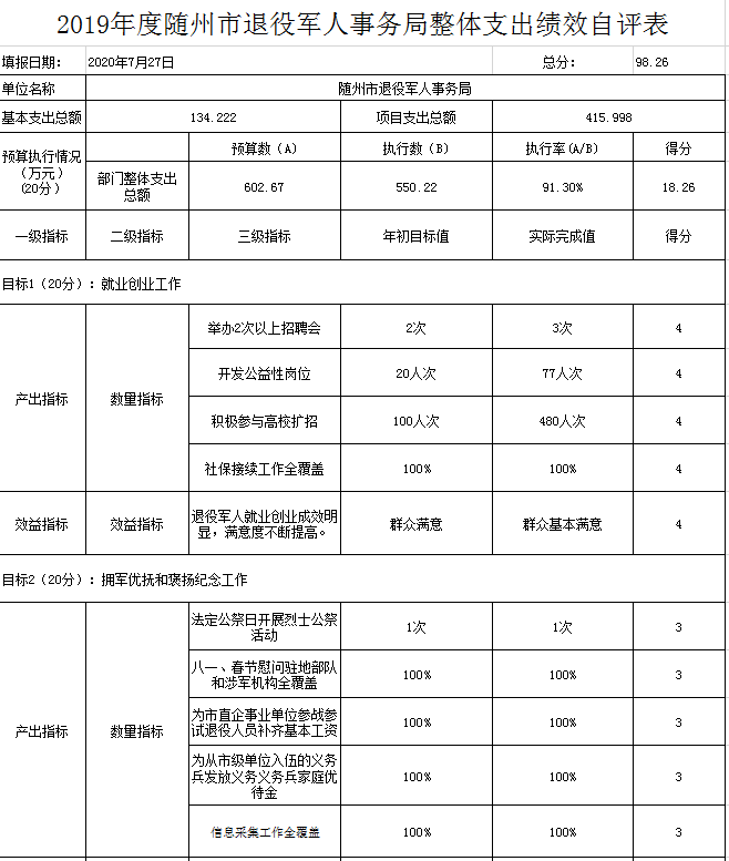2019年度市退役軍人事務局項目支出年初預算經費撥款(補助)602.67萬元,預算下達602.67萬元,實際支出416萬元。主要產出和效果:根據機構工作職責和年度目標工作任務,以黨建為引領,全面加強機關黨的建設;以服務管理體系建設為突破點,有效夯實退役軍人工作基礎;以政策落實為出發點和落腳點,加快推動退役軍人工作全面發展;以涉軍大局穩定為著力點,努力在化解涉軍信訪矛盾上謀求實效。發現的問題及原因:項目設置不夠細化。主要原因是延續歷年項目,未根據工作需要進行及時調整。下一步改進措施:結合工作實際,合理設置項目。