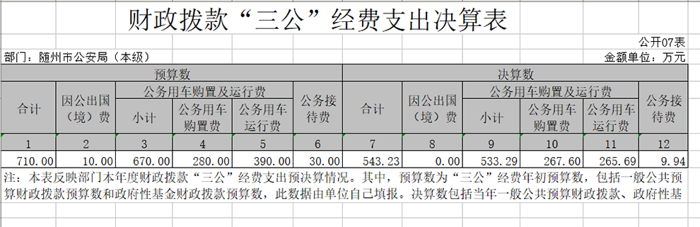 1、2019年隨州市公安局本級“三公經費”預算支出710萬元,決算支出543.23萬元,決算數比預算數減少166.77萬元,減少23.49%。其中:???????