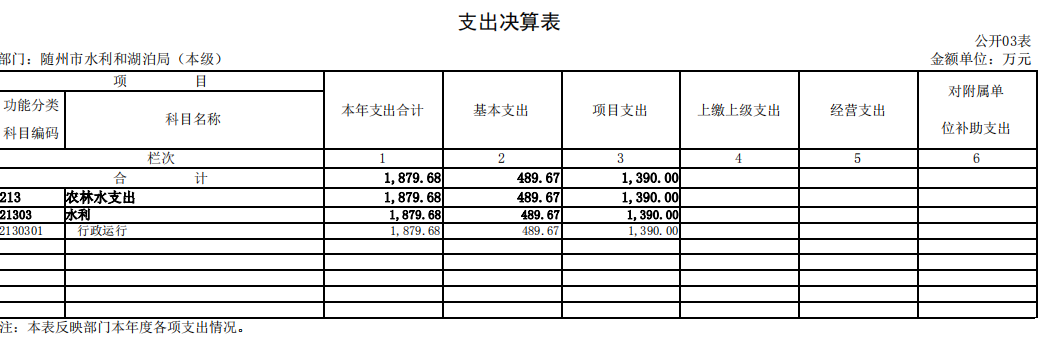 隨州市水利和湖泊局(本級)2019年決算支出總計2191.5萬元,其中本年支出1879.68萬元,年末結轉和結余311.82萬元。比年初預算2135.51萬元增加58.99萬元,增加2.77%;與上年決算2182.88萬元相比增加9.62萬元,增加0.39%。主要是上級專項轉移支付項目增加造成。