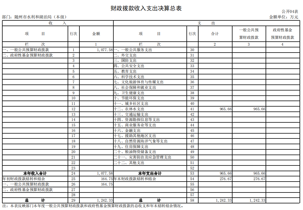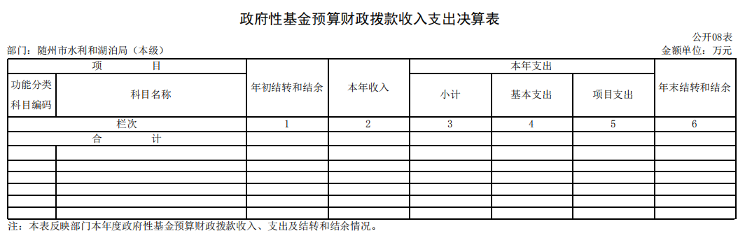 隨州市水利和湖泊局(匯總)無政府性基金預算。隨州市水利和湖泊局(本級)無政府性基金預算。年初預算無政府性基金收入,上年決算也無政府性基金收入。