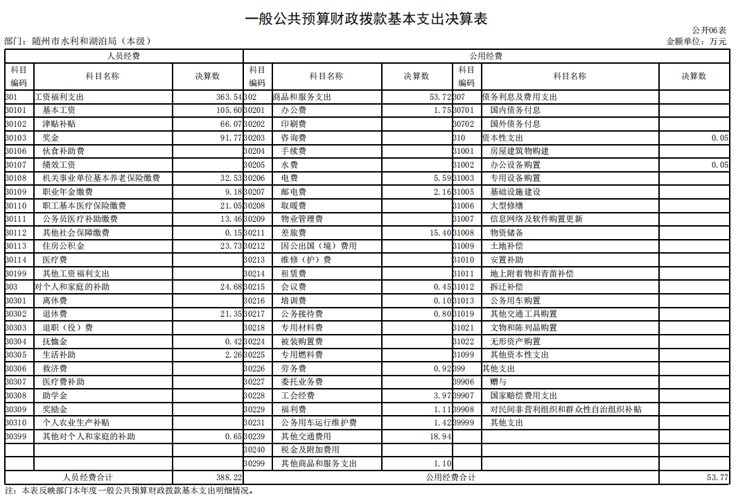 隨州市水利和湖泊局(本級)2019年度機關運行經費53.72萬元,比年初預算91.06萬元減少37.34萬元,比上年決算54.07萬元減少0.35萬元,主要原因是2019年度壓縮開支,同時部分機關運行經費從其他收入中列支。其中辦公費1.75萬元,電費5.59萬元,郵電費2.16萬元,差旅費15.4萬元,會議費0.45萬元,培訓費0.1萬元,公務接待費0.8萬元,勞務費0.92萬元,工會經費3.97萬元,福利費1.11萬元,公務用車運行維護費1.42萬元,其他交通費用18.94萬元,其他商品與服務支出1.1萬元。