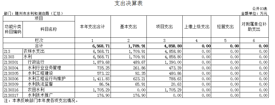 2019年納入部門決算管理單位7個,隨州市水利和湖泊局(本級)、水政監察支隊、水利技術推廣中心、河道堤防建設管理局、先覺廟水庫工程管理局、白云湖水利工程管理局、隨中灌區管理局。