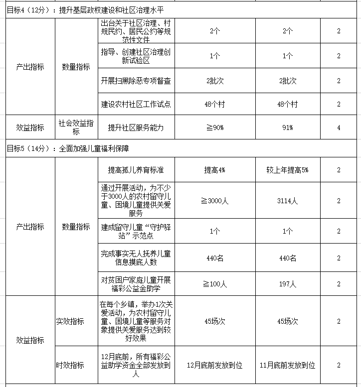 ? 根據(jù)《2019年市直部門整體支出績效自評表》中績效指標分析評分,隨州市民政局2019年部門整體支出績效自評得98.58分,績效等級為優(yōu)。在切實加強社會救助體系建設(shè)、大力發(fā)展慈善公益事業(yè)、加快推進養(yǎng)老服務(wù)業(yè)發(fā)展、全面加強兒童福利保障、切實加強流浪乞討人員救助、提升基層政權(quán)建設(shè)和社區(qū)治理水平、引導(dǎo)社會組織和社會工作健康有序發(fā)展、統(tǒng)籌推進專項社會事務(wù)管理等方面取得良好的社會效益。發(fā)現(xiàn)的問題:一是因部門整體支出的預(yù)算資金安排和使用上仍有不可預(yù)見性,還需加強預(yù)算管理,科學編制預(yù)算;二是工作經(jīng)費短缺,多項工作沒有專項經(jīng)費,影響工作開展;三是加強財務(wù)人員的隊伍建設(shè)和業(yè)務(wù)指導(dǎo),提高績效管理人員業(yè)務(wù)水平,建立績效評價的長期機制。下階段將進一步抓好項目設(shè)置,科學編制預(yù)算。