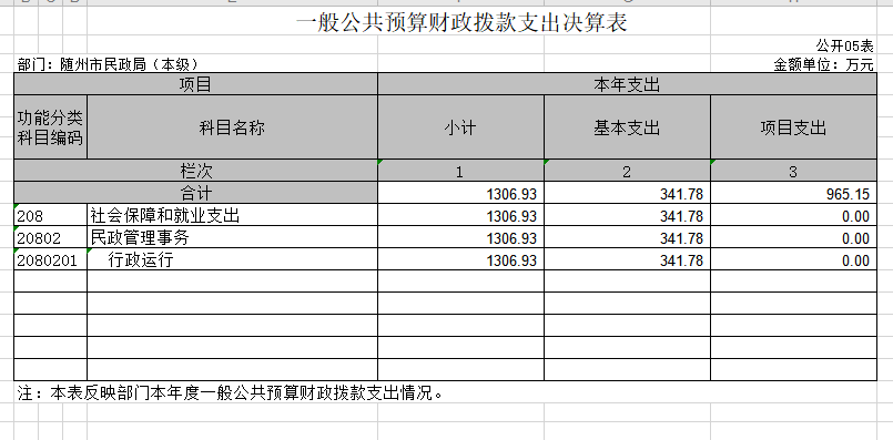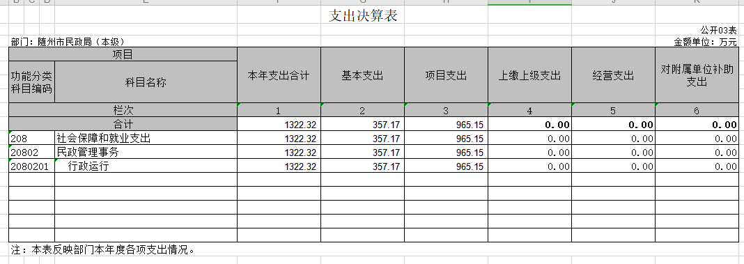 ? 隨州市民政局(匯總)2019年支出總計2851.69萬元,其中本年支出合計2281.26萬元、年末結(jié)轉(zhuǎn)和結(jié)余570.43萬元。支出合計較上年5012.12萬元減少43.1%,主要原因:因機構(gòu)改革,項目資金減少。