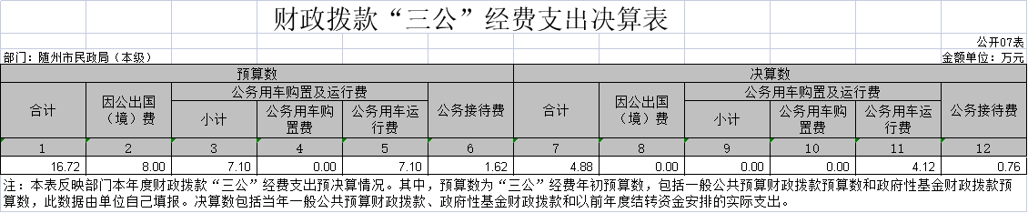 ? 隨州市民政局(匯總)2019年度一般公共預(yù)算財政撥款“三公”經(jīng)費支出年初預(yù)算數(shù)為31萬元,決算數(shù)為6.7萬元,比預(yù)算少24.3萬元,減少78.39%,決算數(shù)較上年的6.25萬元增加0.45萬元,漲幅7.2%,上下控制在10%內(nèi)。主要原因為無因公出國開支,嚴格控制三公經(jīng)費。其中:(1)2019年初預(yù)算因公出國(境)費用8萬元,2019年度實際支出0萬元;(2)2019年初預(yù)算公務(wù)接待費4.56萬元,2019年度實際支出1.28萬元(共接待次數(shù)22次,接待人次115人),比預(yù)算減少3.28萬元,減少71.93%;(3)2019年年初預(yù)算公務(wù)用車費18.44萬元,2019年度實際支出公務(wù)用車運行維護費5.42萬元,比年初預(yù)算減少13.02萬元,減少70.61%。