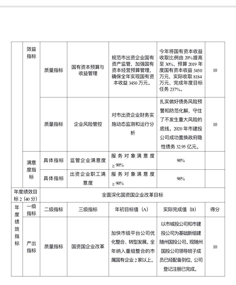 主要產出和效益:1.國有資產保值增值截至12月底,市屬10家國有出資企業資產總額514.74億元,同比增長3.06%;實現營業收入14.67億元,是年度目標任務6億元的?2.45倍;實現利潤2.39億元,是年度目標任務8000萬元的2.99倍;上繳2019年度國有資本經營收益8184萬元,是年度目標任務3450萬元的2.37倍。2.加快市級平臺公司優化整合、轉型發展。以市城投公司和市建投公司為基礎新組建隨州國投公司?,F隨州國投公司領導班子成員已經配備到位,公司登記注冊已完成,市政府同意將市城市排水公司等10家企業整合到隨州國投公司,支持隨州國投公司發展的一攬子措施已報市政府擬上政府常務會審議通過,屆時該公司將步入高質量發展快車道。3.央省企合作與招商引資成效顯著。截止12月底,簽訂框架協議項目2個,達成意向性合作項目3個,新引進央企合作項目2個,總投資55.4億元。4.經營性國有資產統一監管市直有改革任務的企業共50家,其中20家企業已完成注銷,16家企業納入集中統一監管,超額完成年度目標任務。我市經營性國有資產集中統一監管改革走在省內市州前列,成功做法與經驗得到省國資委的肯定與表揚,已初選申報為全省國資國企改革工作交流項目。