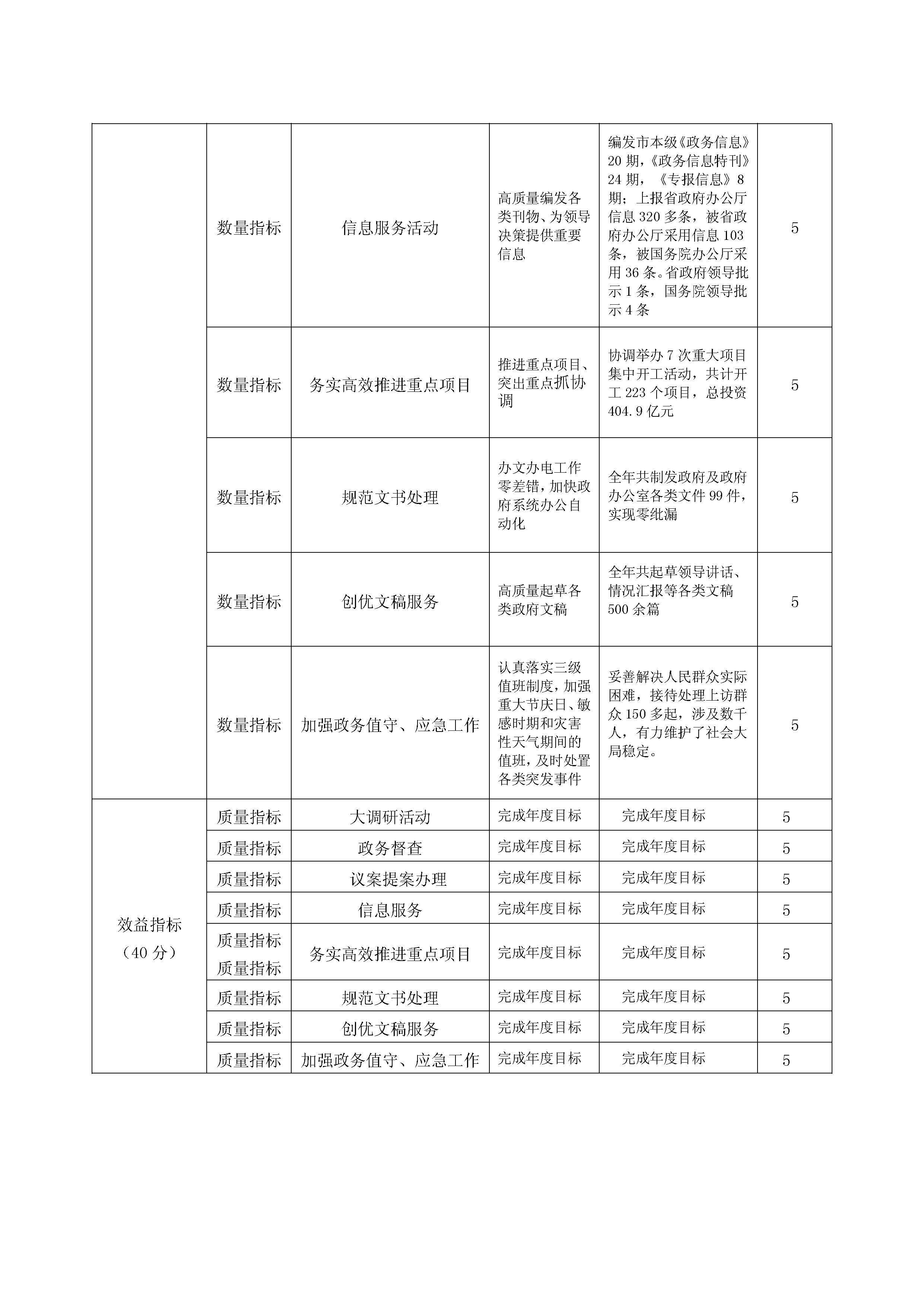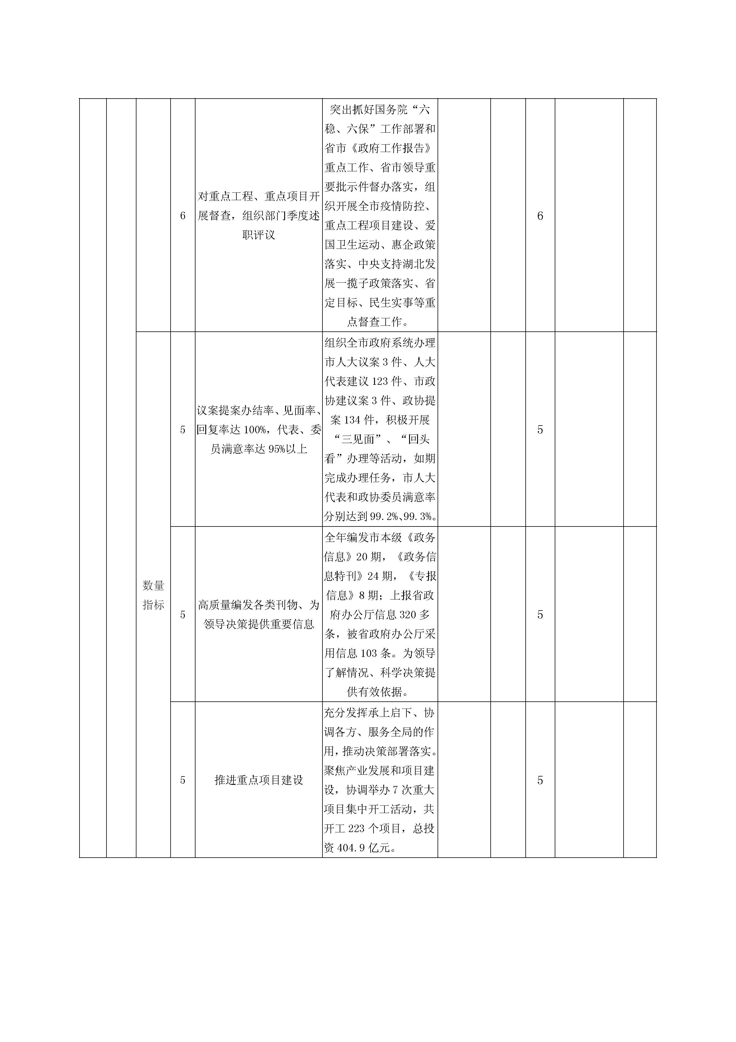 主要產(chǎn)出和效益:1、加強調(diào)查研究。持續(xù)開展政府系統(tǒng)大調(diào)研活動,提高調(diào)查研究的精準度,制定《關(guān)于印發(fā)2020年全市政府系統(tǒng)“品質(zhì)隨州”建設(shè)重點調(diào)研課題的通知》。圍繞優(yōu)化營商環(huán)境、“十四五”規(guī)劃編制、鄉(xiāng)村振興、防范化解重大金融風險等重點課題深入基層、企業(yè)調(diào)研百余次,積極建言獻策,為市政府領(lǐng)導(dǎo)把握全局、科學(xué)決策提供及時、準確、可行的參考建議。2、加強信息服務(wù)。全年編發(fā)市本級《政務(wù)信息》20期,《政務(wù)信息特刊》24期,《專報信息》8期;上報省政府辦公廳信息320多條,被省政府辦公廳采用信息103條,被國務(wù)院辦公廳采用36條。省政府領(lǐng)導(dǎo)批示1條,國務(wù)院領(lǐng)導(dǎo)批示4條,為領(lǐng)導(dǎo)了解情況、科學(xué)決策提供有效依據(jù)。3、統(tǒng)籌協(xié)調(diào)務(wù)實高效。充分發(fā)揮承上啟下、協(xié)調(diào)各方、服務(wù)全局的作用,推動決策部署落實。聚焦產(chǎn)業(yè)發(fā)展和項目建設(shè),協(xié)調(diào)舉辦7次重大項目集中開工活動,共計開工223個項目,總投資404.9億元。4、辦文辦會求精求細。全年共制發(fā)市政府及政府辦公室各類文件99件,實現(xiàn)零紕漏。倡導(dǎo)落實“短、實、新”文風,高質(zhì)量起草各類文稿500余篇。5、推進重點工作落實落地。圍繞奮力奪取疫情防控和經(jīng)濟社會發(fā)展雙勝利,突出抓好國務(wù)院“六穩(wěn)”“六保”工作部署和省市《政府工作報告》重點工作、省市領(lǐng)導(dǎo)重要批示件督辦落實,組織開展全市疫情防控、重點工程項目建設(shè)、愛國衛(wèi)生運動、惠企政策落實、中央支持湖北發(fā)展一攬子政策落實、省定目標、民生實事等重點督查工作。6、扎實做好“兩案”辦理工作。組織全市政府系統(tǒng)辦理市人大議案3件、人大代表建議123件、市政協(xié)建議案3件、政協(xié)提案134件,積極開展“三見面”、二次辦理、“回頭看”辦理等活動,如期完成辦理任務(wù),市人大代表和政協(xié)委員滿意率分別達到99.2%、99.3%。7、運行保障規(guī)范有序。建立市長工作例會機制,建立定期召開市政府常務(wù)會議、黨組會議機制,及時學(xué)習最新精神,部署重點工作。建立分工協(xié)作機制,完善AB角崗位替代制度,不折不扣落實24小時值班、領(lǐng)導(dǎo)帶班、三級值班以及領(lǐng)導(dǎo)外出報備等制度。積極協(xié)調(diào)處置矛盾糾紛,今年共接待處理到市政府上訪群眾150多起,涉及數(shù)千人,有力維護了社會大局穩(wěn)定。