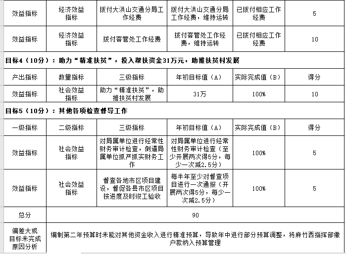 各部門(mén)應(yīng)當(dāng)按照如下格式說(shuō)明:根據(jù)預(yù)算績(jī)效管理要求,本部門(mén)組織對(duì)2020年度部門(mén)整體支出績(jī)效評(píng)價(jià),評(píng)價(jià)情況來(lái)看,整體支出績(jī)效評(píng)價(jià)自評(píng)得分為90分。