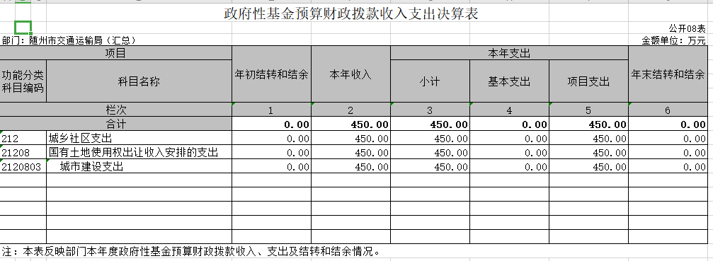 隨州市交通運(yùn)輸局(系統(tǒng)匯總) 政府性基金性收支450萬(wàn)元,相比去年增加450萬(wàn)元,主要是市公路局報(bào)送,待資金達(dá)到之后全額撥付下級(jí)單位。
