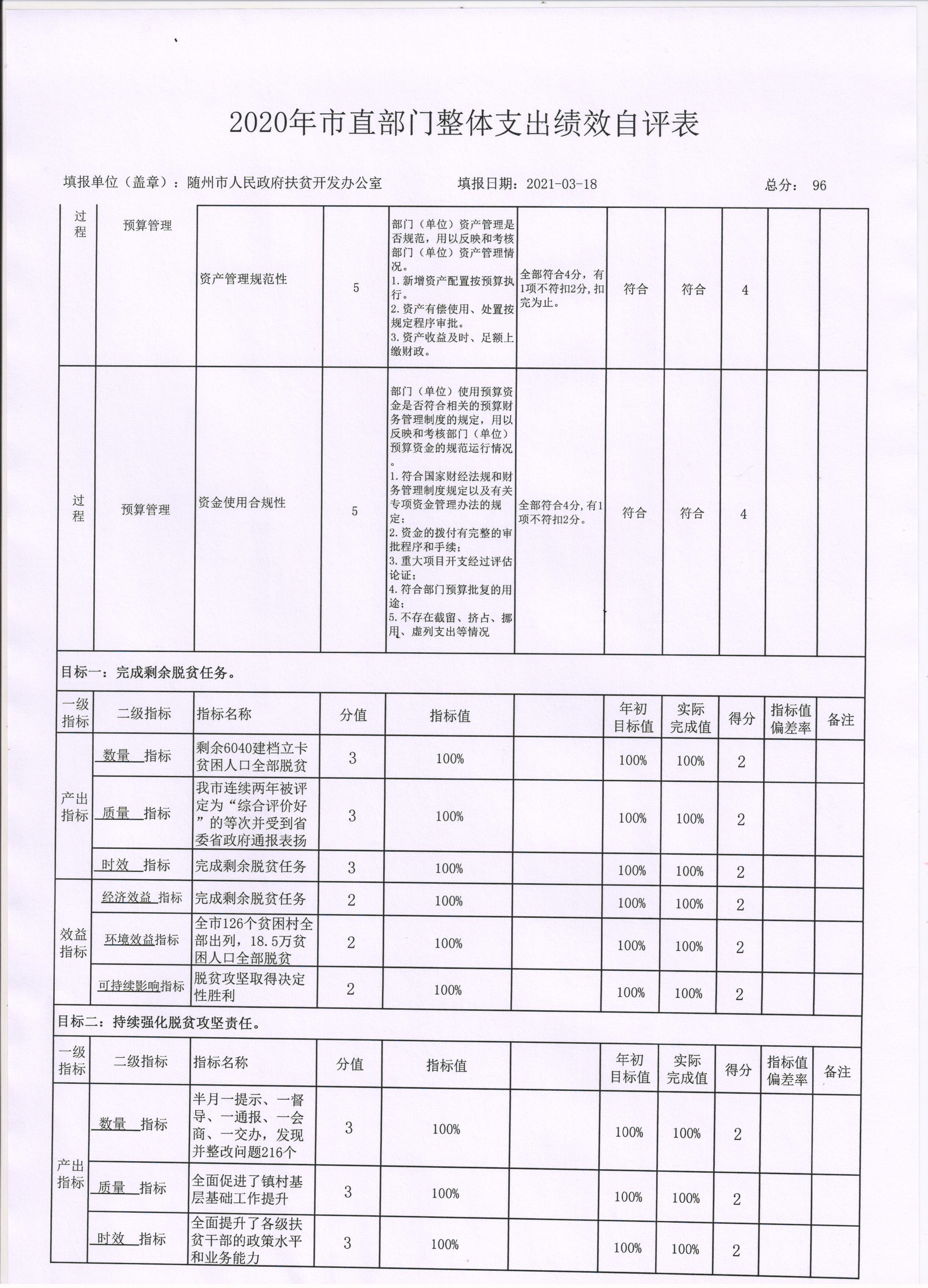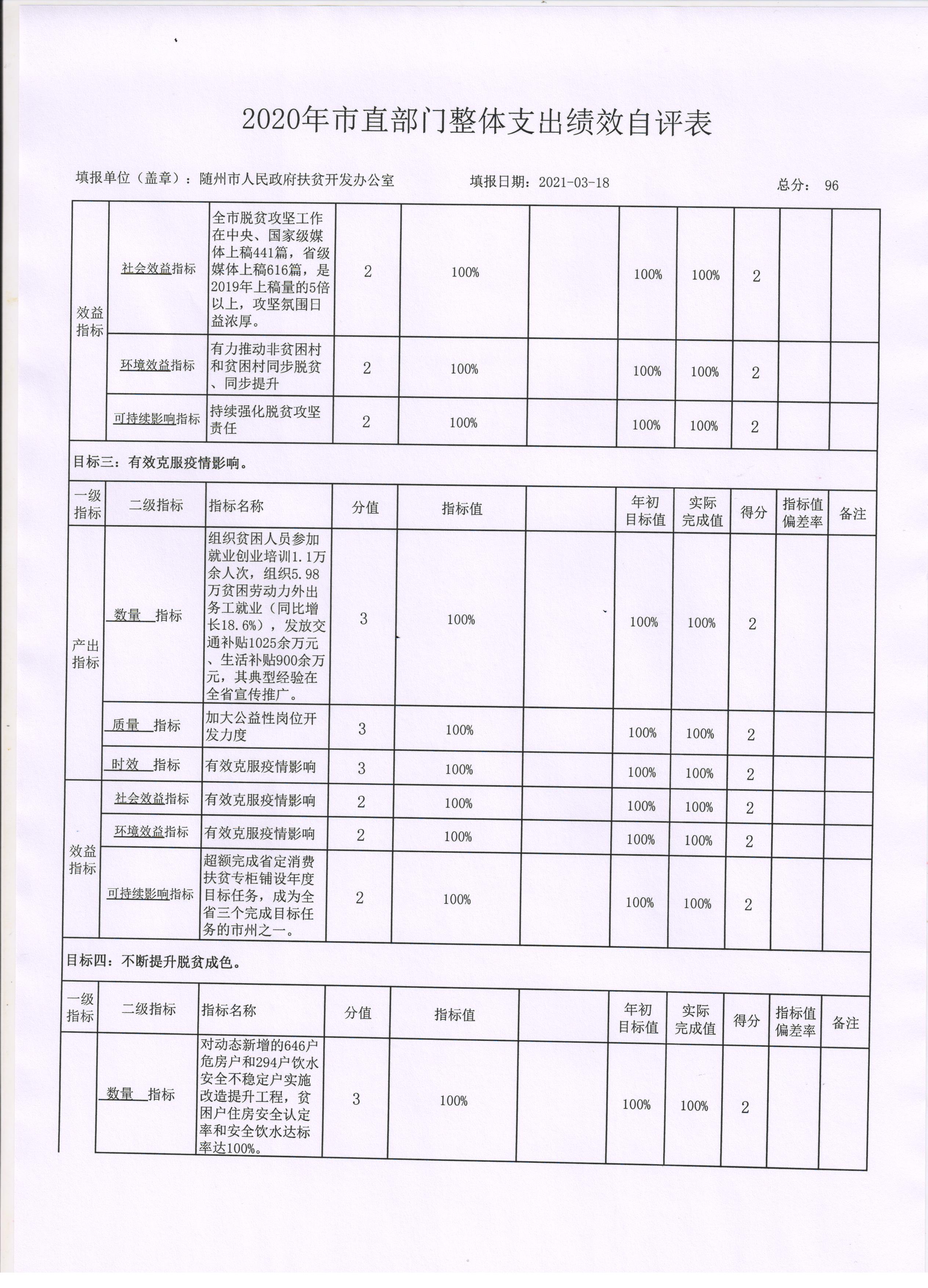 隨州市人民政府扶貧開發辦公室2020年度部門整體支出績效評價自評分為96分,績效等級為優。
