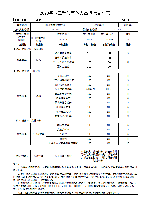 根據《2020年市直部門整體支出績效自評表》中績效目標完成情況評分,隨州市農業局本級2020年部門整體支出績效自評得分92分。