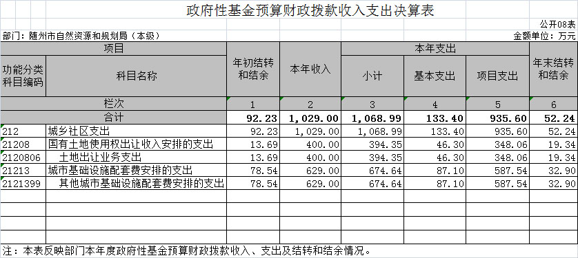 八、政府性基金預(yù)算財(cái)政撥款收入支出決算表(公開(kāi)表08表)