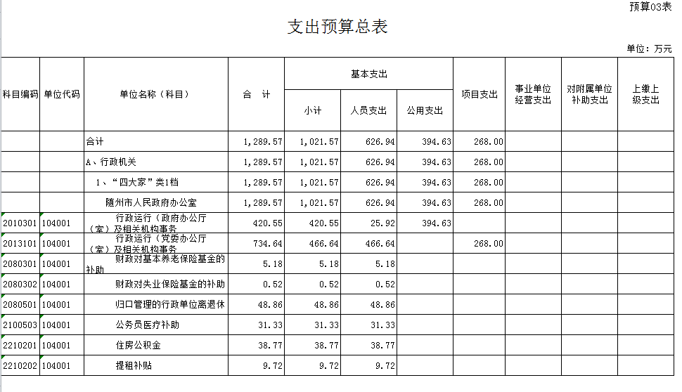 市政府辦公室2016年支出預算總額為1289.57萬元,其中,基本支出1021.57萬元,項目支出268萬元。