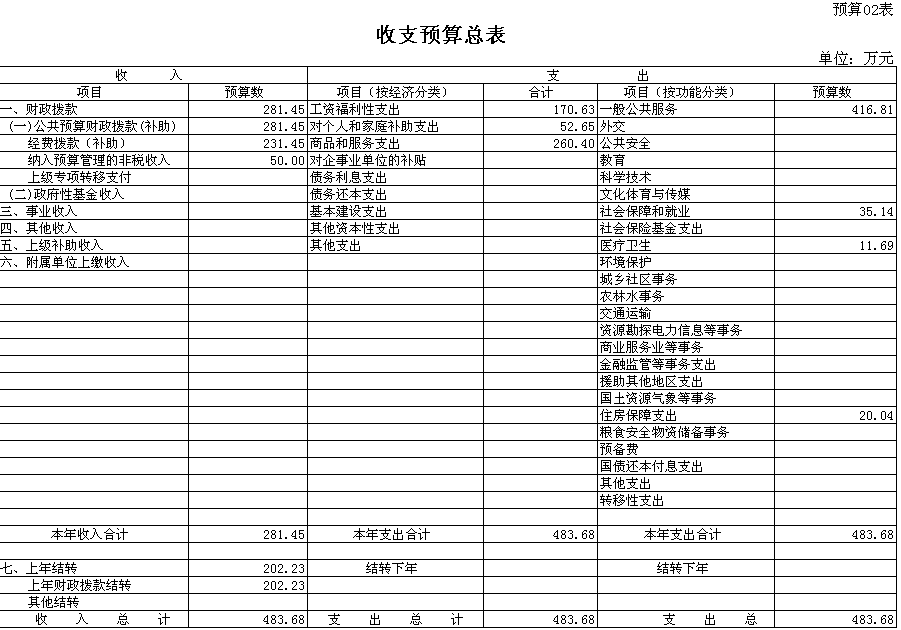 2016年預算支出為483.68萬元。其中:一般公共服務支出416.81萬元,社會保障和就業支出35.14萬元,醫療衛生11.69萬元,住房保障支出20.04萬元。