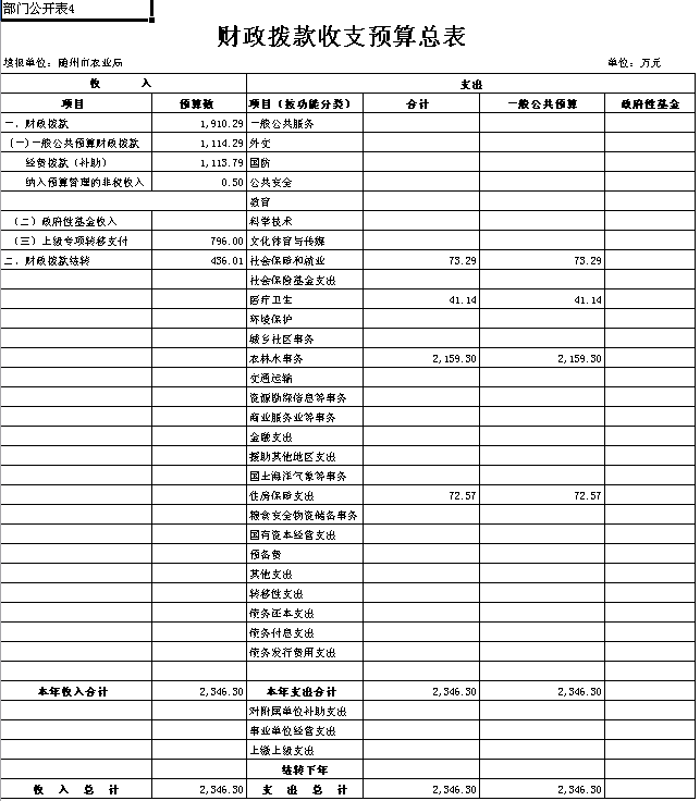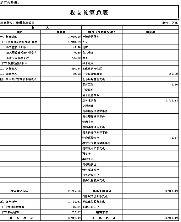 ??2017年隨州市農(nóng)業(yè)局(匯總)收入預(yù)算總額3944.19萬元,其中隨州市農(nóng)業(yè)局(本級(jí))1482.35萬元、隨州市畜牧獸醫(yī)局477.34萬元、隨州市經(jīng)管局151.21萬元、隨州市農(nóng)機(jī)局160.34、隨州市水產(chǎn)局93.43萬元、隨州市蔬菜辦224.39萬元、隨州市農(nóng)業(yè)行政執(zhí)法支隊(duì)315.50萬元、隨州市農(nóng)業(yè)廣播學(xué)校1039.63萬元。
