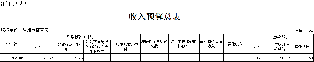 招商局2017年部門收入預算248.45萬元,其中:財政撥款收入78.43萬元,上年結轉170.02萬元。收入較上年減少10.84萬元,同比下降4.4%,主要是因為人員調動,人員支出減少。