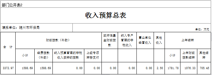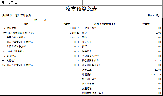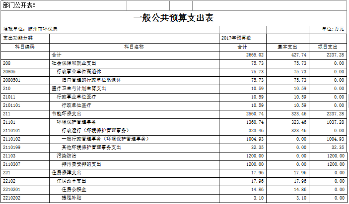 2017年環保局系統納入部門預算管理單位6個,市環保局、市環保局曾都分局、市環境監察支隊、市環境保護監測站、市環保局高新園區分局、市機動車排氣污染監督管理中心。本級單位人員編制18人,實有人員18人,離退休人數12人。
