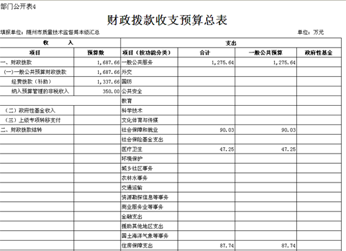 隨州市質監局部門預算由市局機關、下設的3個直屬副處級單位,即市局稽查分局、市局行政許可分局、市局城區分局和3個正科級直屬事業單位,即隨州市產品質量監督檢驗所、隨州市信息和標準化所、隨州市行政許可技術審查中心共7個單位組成。市本級單位數量較上年減少隨州市計量檢定測試所1個單位,以下數據均不含該單位。