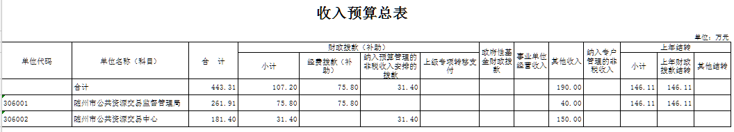 隨州市公共資源交易監督管理局2017年收入預算總額261.91萬元,其中公共預算財政撥款(補助)75.8萬元,非稅收入31.4萬元,其他收40萬元,上年結轉146.11萬元。較去年收入預算總額減少18.4萬元,減少2%。。