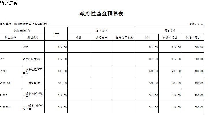 2018年城管局系統(tǒng)政府性基金817.5萬(wàn)元。其中延續(xù)性基金517.5萬(wàn)元,比去年增加項(xiàng)目基金300萬(wàn)元。比上年增加了40%,主要是政府新增項(xiàng)目。