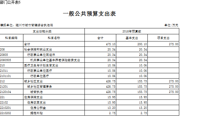 2018年本級(jí)財(cái)政支出2670.36萬(wàn)元,其中基本支出200.10萬(wàn)元,增加了3.42萬(wàn)元,較上年增加2%,主要用于人員工資、公用經(jīng)費(fèi)和社會(huì)保障繳費(fèi)的支出,是由于工資及社會(huì)保障繳費(fèi)上調(diào);對(duì)附屬單位補(bǔ)助支出260.25萬(wàn)元,較上年減少5%,主要是經(jīng)費(fèi)不足;項(xiàng)目支出2210.01萬(wàn)元,較上年增加1022.78萬(wàn)元,主要用于數(shù)字城管建設(shè)及城區(qū)旱廁改造等延續(xù)性工程,項(xiàng)目支出占支出總額的82%,前期工程已經(jīng)完成,等待驗(yàn)收付款。